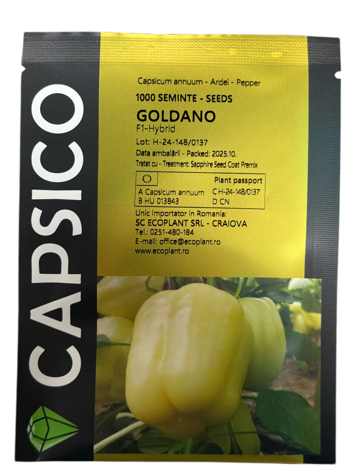 Fructele ardeiului Goldano F1 au o grosime de 7-9 mm in pulpa, dimensiune de 8-10 cm, exterior lucios de culoare alb-galbui, greutate medie de 170 - 200 grame, in 3-4 lobi.