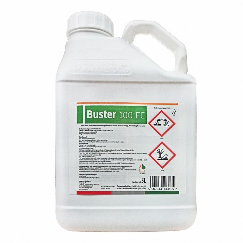 Buster 100 EC conţine quizalofop-P-etil, se prezintă sub formă de concentrat emulsionabil, de culoare gălbuie, cu miros caracteristic.