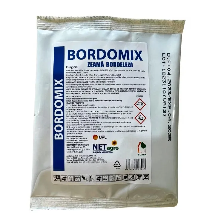 BORDOMIX 500 GR este un fungicid de contact cu actiune preventiva si curativa, bazat pe sulfat de cupru. Acesta este utilizat in combaterea bolilor specifice la vita de vie, pomi fructiferi, legume si alte culturi agricole, avand eficienta ridicata impotriva manei, bacteriozelor, patarii frunzelor si cancerului bacterian.